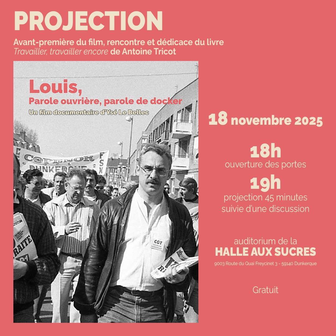 Le 18 novembre, Ă 19h, exactement au mĂȘme endroit, jâaccompagnerai YsĂ© Le Bellec lors de la prĂ©sentation en avant-premiĂšre de son film Louis, Parole ouvriĂšre, parole de docker dont je suis un personnage involontaire. Avec Franck di Razza, ils ont tournĂ© ce film en mĂȘme temps que je menais mon enquĂȘte pour le livre Travailler, travailler encore. Il porte donc sur la mĂȘme histoire. Câest un beau travail autour dâarchives vidĂ©os trĂšs peu connues et des interviews aux belles tonalitĂ©s ouvriĂšres.