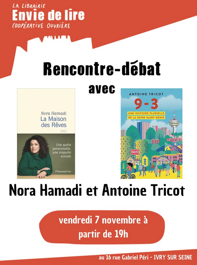 ![]() | Avec Nora HamadiPuis toujours le 7 novembre, Ă 19h, je serai Ă Ivry-sur-Seine avec lâamie Nora Hamadi. A lâinvitation de Hugues et de la librairie Envie de lire, nous y parlerons de nos livres respectifs, dâenfance en quartier populaires, de stigmatisation et de dĂ©sengagement de lâĂtat, mais aussi dâespoir et de solidaritĂ©. |