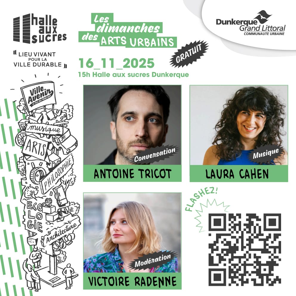 Le 16 et le 18 novembre, deux rencontres Ă Dunkerque. La premiĂšre a lieu le dimanche 16 novembre aprĂšs-midi, je suis invitĂ© Ă discuter de mon travail dans le cadre des Dimanches des Arts urbains dans la trĂšs belle Halle-aux-sucres sur le port. jây rĂ©pondrai aux questions de la journaliste Victoire RadĂšne et on y Ă©coutera le